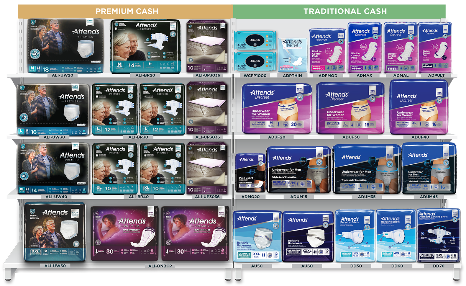 Getting the right mix of product on your shelf is important to meet the needs of consumers in your stores. Here are our recommended Attends Planograms. If you have any questions or would like specific advice for your store, contact us below.